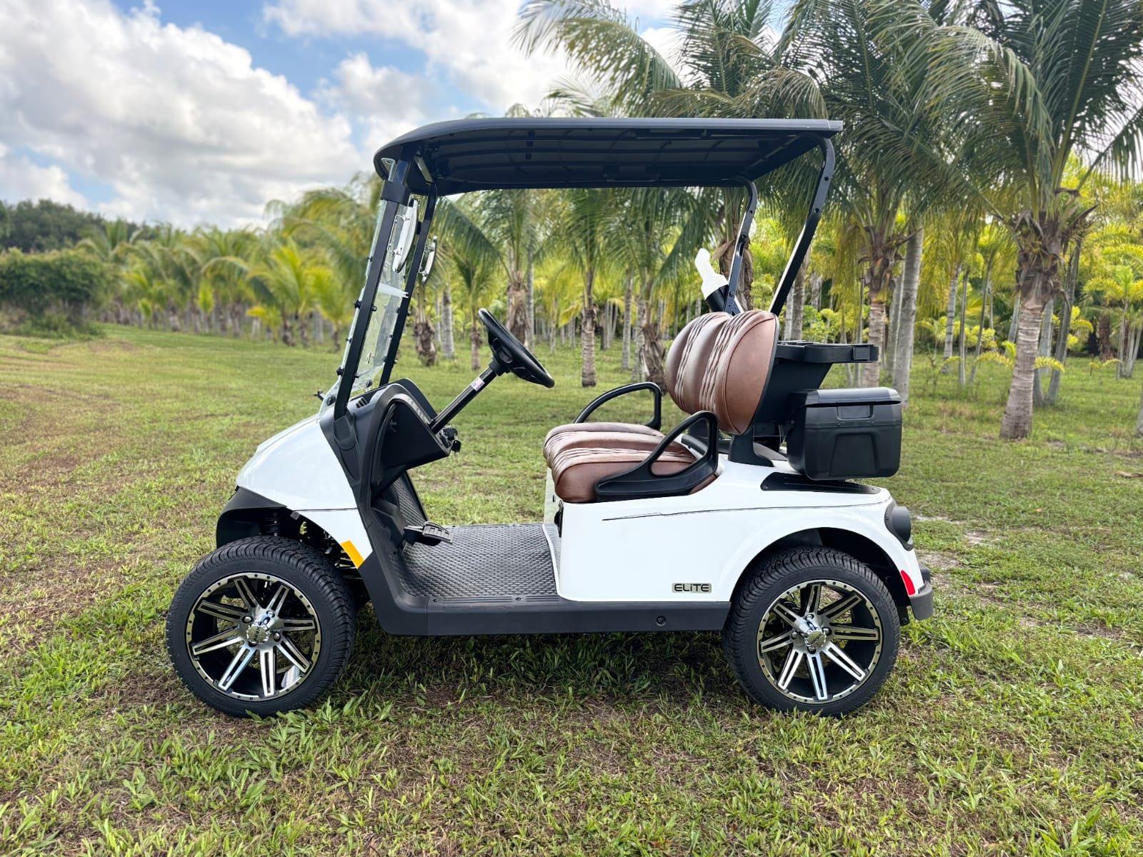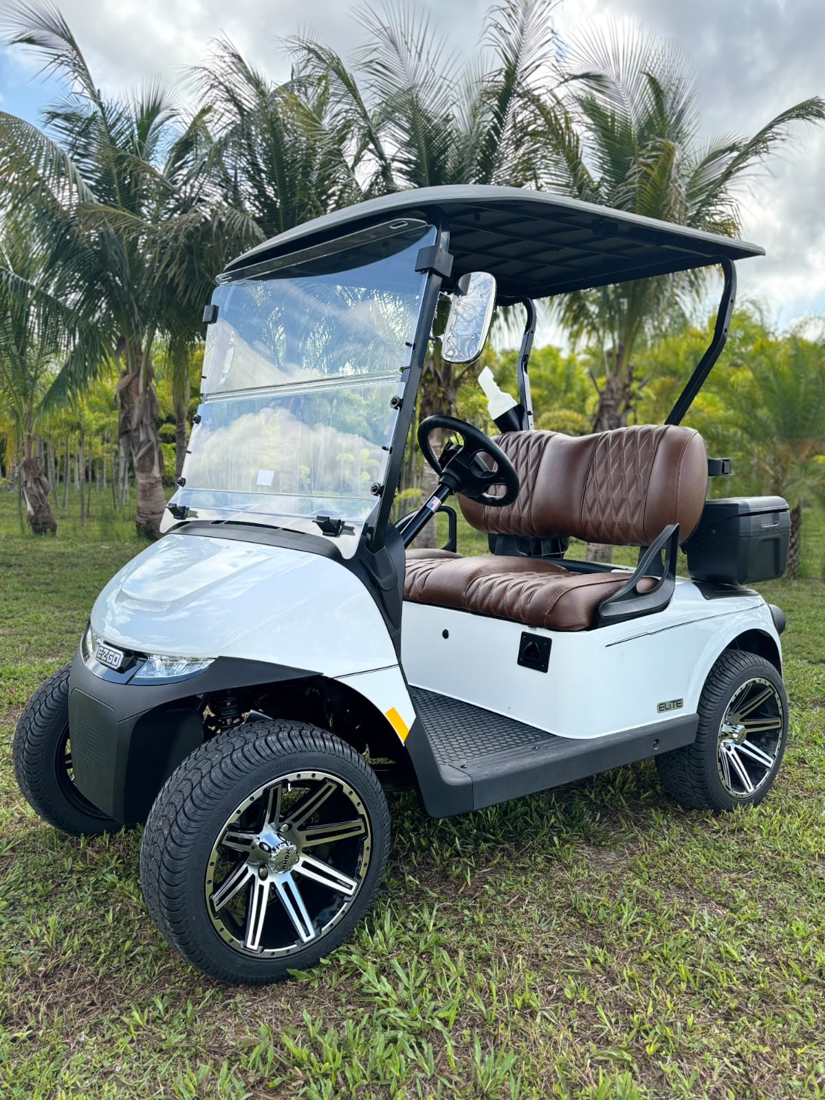 The 2026 E-Z-GO RXV2 Elite Bright White offers a stylish and comfortable ride with custom wheels and amarillo signature seats. Perfect for golf or neighborhood cruising, this golf-ready cart combines performance and luxury in a sleek, bright white finish. Available now at Sunshine Golf Car.