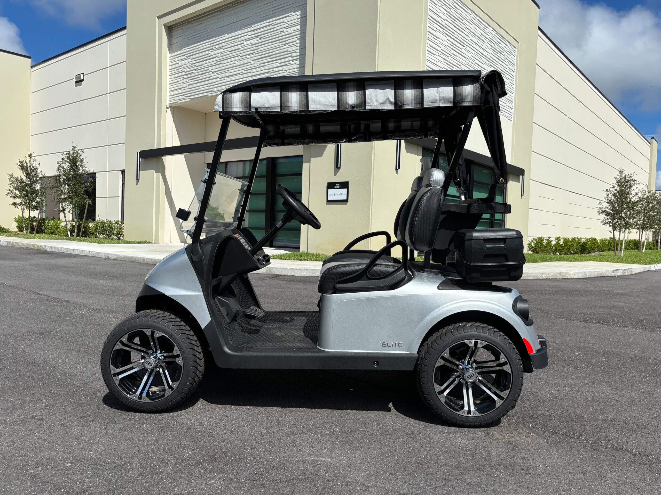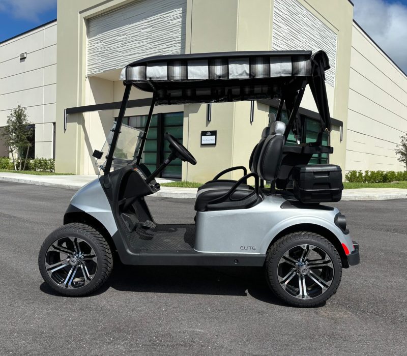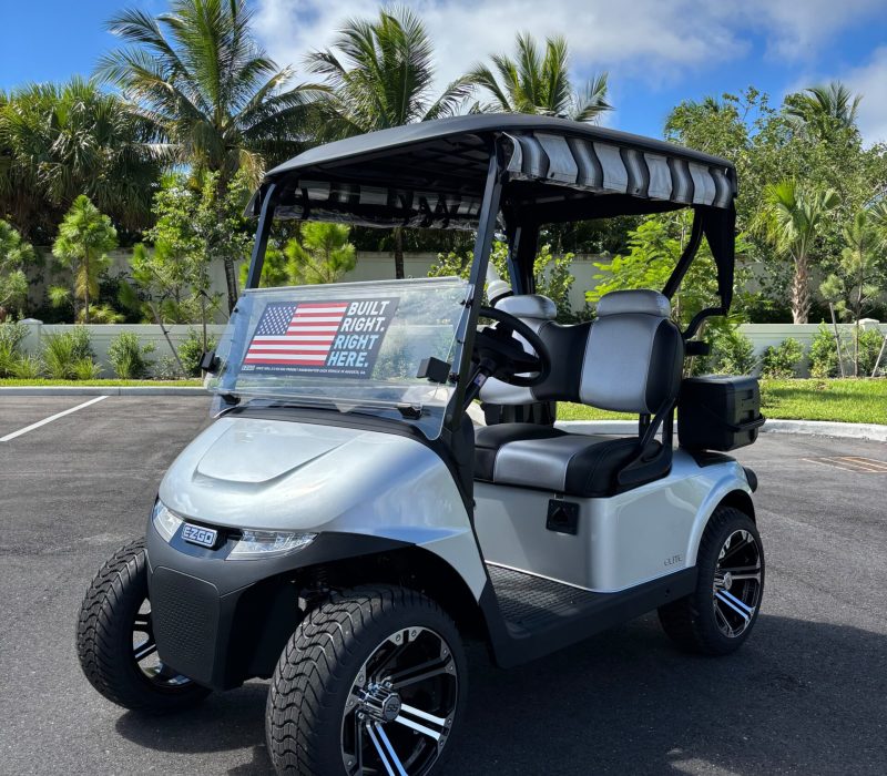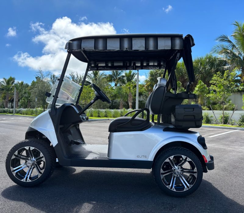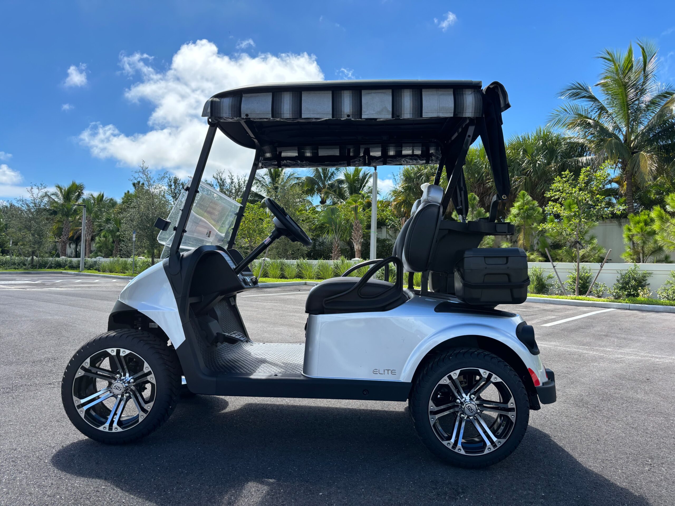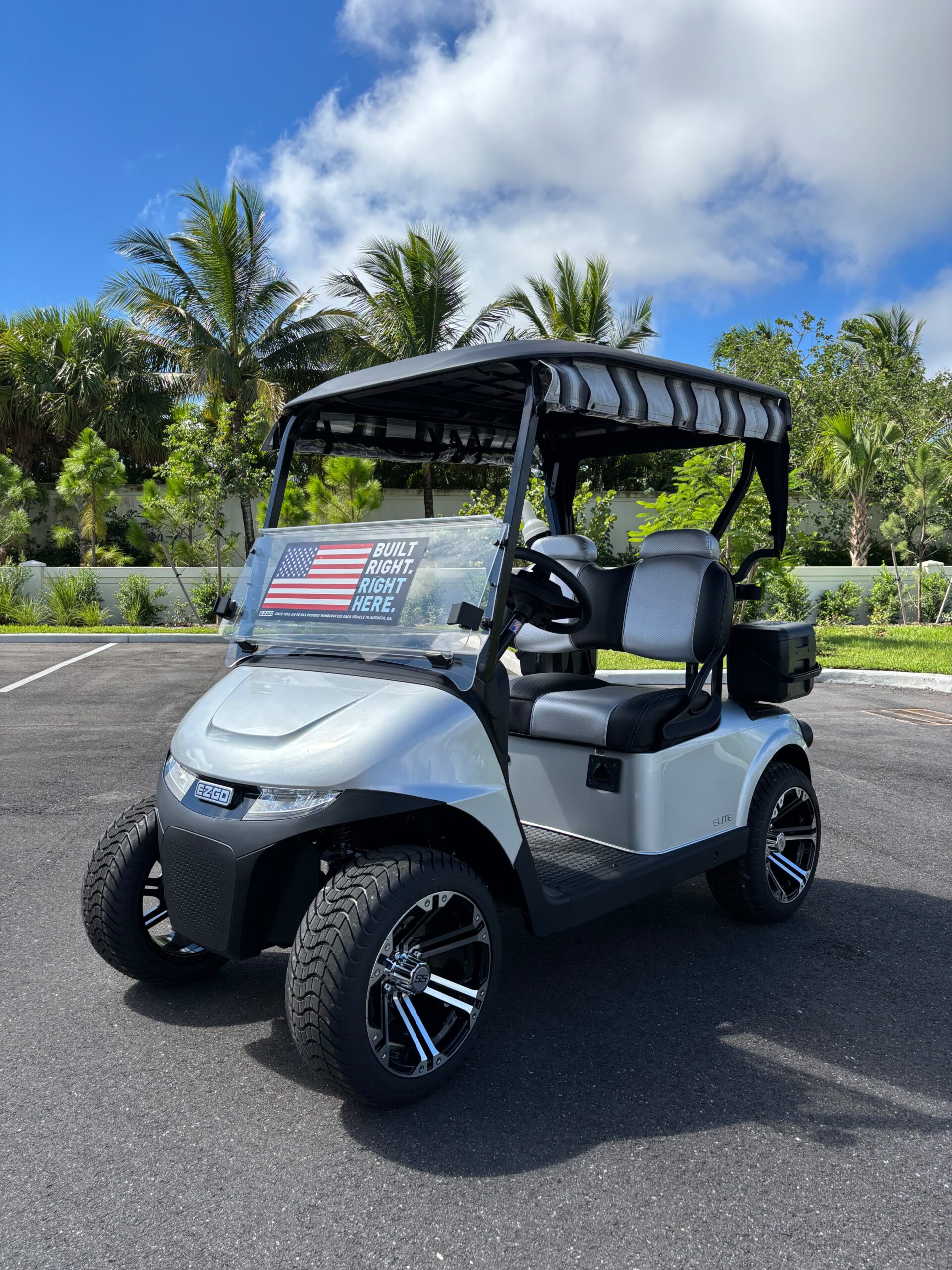 Turn heads on and off the course with the 2026 E-Z-GO RXV2 ELiTE in sleek Platinum. Designed for golfers and style-conscious drivers alike, this cart blends high-performance ELiTE™ lithium battery technology with luxury upgrades like custom seats, 14″ wheels, and a premium Sunbrella enclosure, perfect for South Florida’s sun and showers.